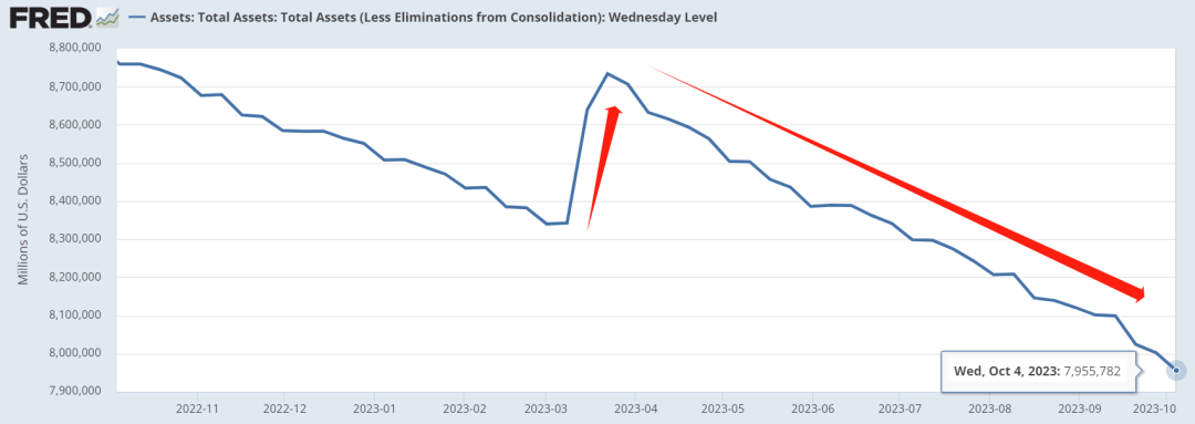 10月5日,美联储公布的资产负债表显示,截止10月4日,美联储资产跌至7.95万亿,创近两年多以来的低点。