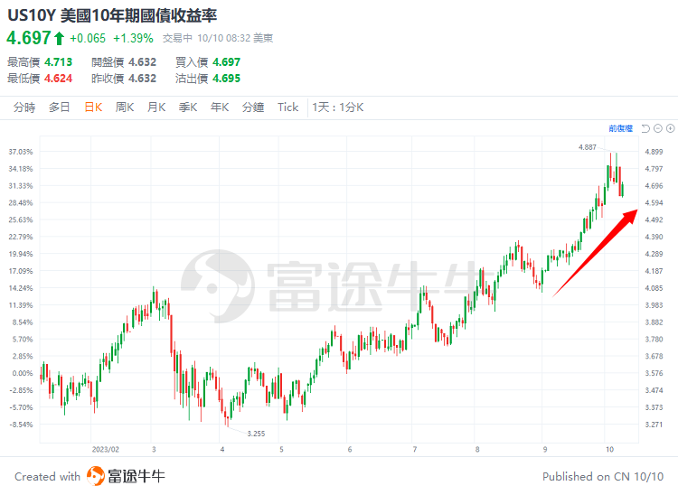 自9月以来,10年期美债收益率已从4.1%上涨至4.8%,美债迎来史上最大的熊市。无风险收益率的飙升,导致纳指和标普500在9月跌去6%。