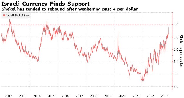 在哈马斯上周六的袭击之前,以色列央行一直拒绝支持谢克尔,尽管由于投资者对政府有争议的削弱司法权力的努力感到担忧,谢克尔大幅下跌。在彭博追踪的一篮子31种主要货币中,谢克尔是今年跌幅最大的货币之一。