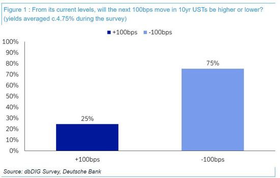 不过,德意志银行于2023年10月进行的一项全球金融市场调查发现,75%的受访者认为美国10年期国债收益率的下一个100基点的变动将是下跌(调查期间平均收益率为4.75%)。这与6月份的结果形成了很大的反转。