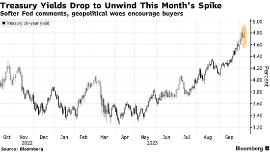 美国10年期国债收益率在周二重新开市后下跌了多达18个基点,至4.62%。由于投资者增加对美联储将在2023年底前维持利率不变的押注,两年期美债收益率下滑了16个基点,至4.93%。