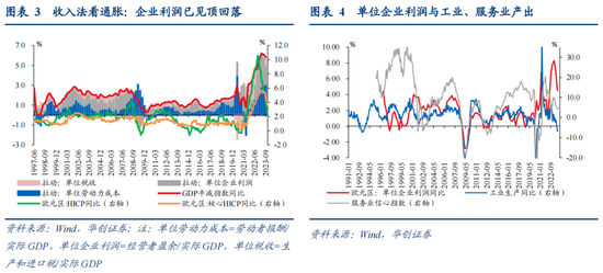 ①针对单位企业利润,目前来看,已经出现见顶回落迹象。展望后续,考虑到紧缩政策的滞后效应,工业、服务业产出或仍承压(详见报告《欧元区:“滞”与“胀”的两难》),驱动企业利润进一步下行。