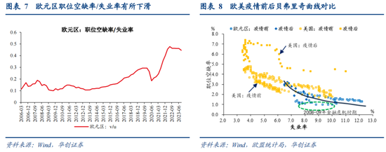 特别是,在v/u基础上,我们进一步对比欧美的贝弗里奇曲线(关于贝弗里奇曲线的介绍,详见《贝弗里奇曲线告诉我们软着陆的可能性到底有多大?》)。从数据中发现,相比于疫情后的美国就业市场,欧元区的就业市场供需情况并不利于产生显著的工资压力(供给不如美国短缺、需求不及美国强韧),这可能也意味着,欧元区工资通胀的降温更快,欧元区可能是更早的降息者。