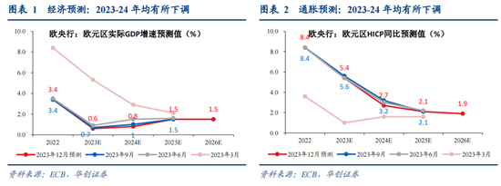 2023-24年经济和通胀展望均较9月预测下调,显示基本面承压、偏下行。①经济预测方面,12月,欧央行对2023、2024年实际GDP增速预测分别为0.6%(9月预测为0.7%)、0.8%(9月预测为1%)。下调的原因主要是:“2023年三季度经济数据疲软且经济状况恶化。最近更多的负面结果以及出口前瞻指标显示2023-2025年净出口倾向下行。”②通胀预测方面,12月,欧央行对2023、2024年HICP同比预测分别为5.4%(9月预测值为5.6%)、2.7%(9月预测为3.2%)。下调的原因主要是能源价格意外下行。