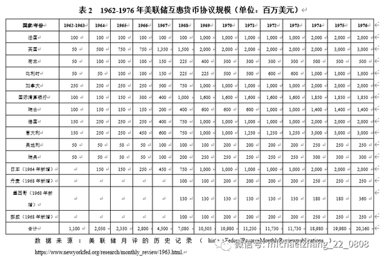 20世纪60年代至70年代中期,美联储陆续与全球14个主要发达国家建立互惠货币协议(见表2)。1962年3月,美联储同法国中央银行建立第一个货币互换协定。1962年至1963年,美联储分别同法国、英国、荷兰、比利时、加拿大、瑞士、德国、意大利、奥地利、瑞典等10个国家的中央银行,及国际清算银行签订互惠货币协议。在1964年和1968年,美联储又分别与日本、丹麦、墨西哥和挪威中央银行签订互惠货币协议。截至1976年,美联储已经同14个国家中央银行签订互惠货币协议,互惠货币协议额度高达到201.6亿美元。