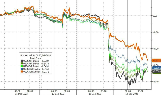2年期美债收益率本周已经下行34bps,30年期美债收益率也同步跌27bps,同时10年期美债收益率跌至4%下方。