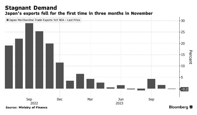 日本11月出口三个月来首次小幅下降,这是日本经济面临压力的新迹象。目前,日本正努力从夏季的萎缩中复苏。