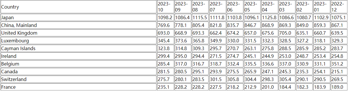 在其他美国海外“债主”方面,日本在10月仍是美国国债最大的海外持有国。当月日本的美国国债持仓为1.0982万亿美元,较9月环比增持了118亿美元,暂时止住了此前连续三个月连续减持美债的势头。在9月,日本曾创下自4月份以来最大的单月减持美债纪录。
