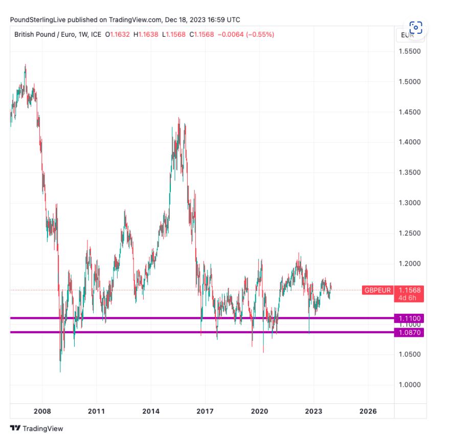德意志银行表示,2024年英镑对欧元汇率将受前首相利兹·特拉斯(Liz Truss)引发的危机影响,预计英镑将跌至2022年9月特拉斯引入其备受争议的预算时对欧元的最低水平。
