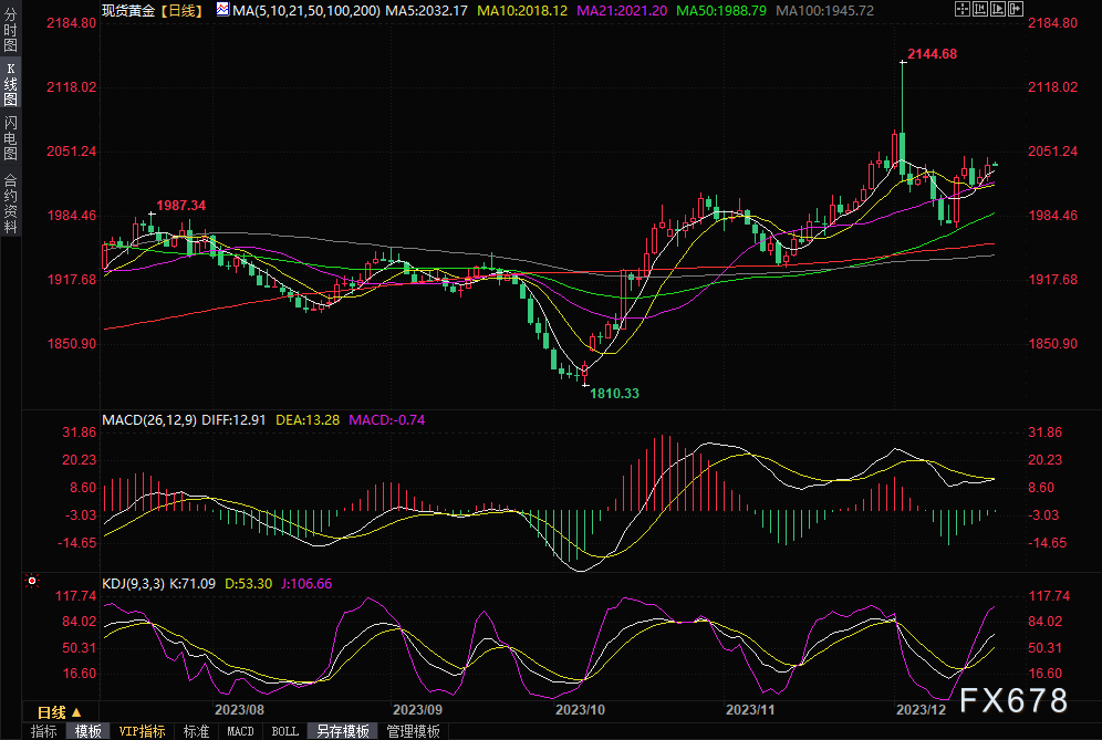 现货黄金收涨0.64%,收报2040.15美元/盎司,盘中最高触及2046.86美元/盎司,接近上周四最触及的近两周高点2047.55阻力。