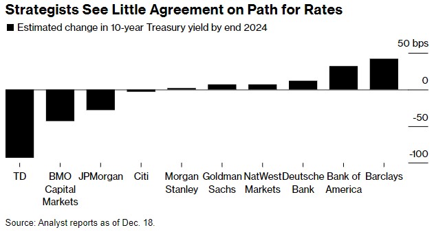上周美联储突然放鸽,导致美国国债收益率大幅下跌,迫使许多华尔街策略师放弃了几天前对2024年的预测,但多头和空头之间仍存在分歧。