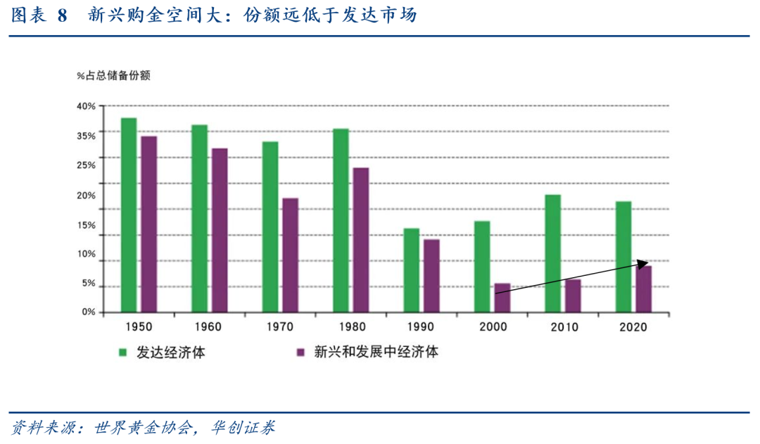 空间大。据IMF,黄金在新兴市场国家中的资配份额低于10%,不到发达经济体一半。