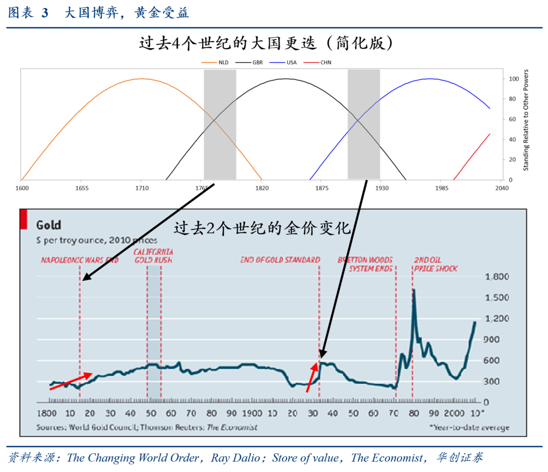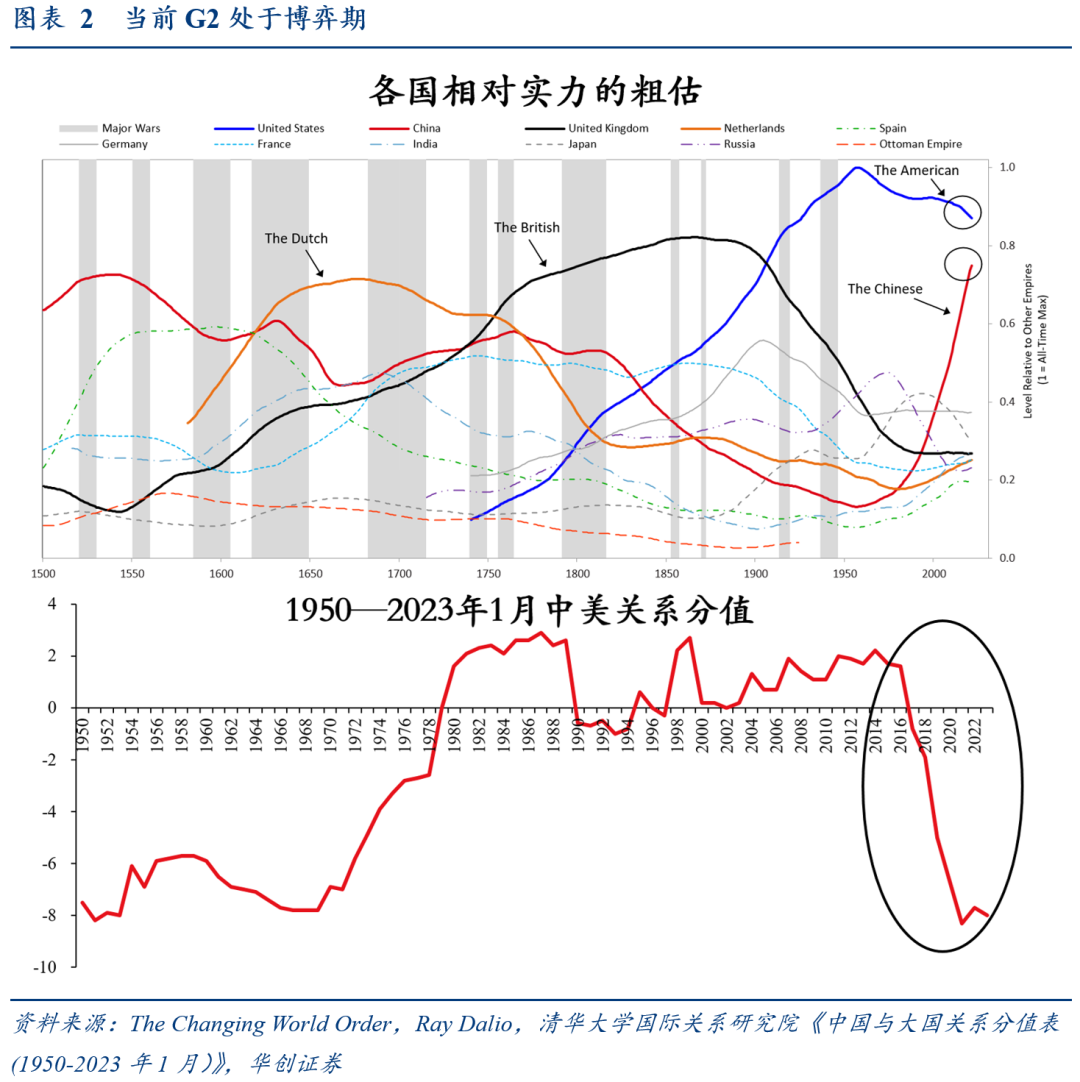 当前G2处于博弈期:根据达里奥对500年大国更替的研究,中美综合实力相当;清华大学国际关系研究院中美关系分值表显示,截至2023年1月,中美关系处于建国以来低点;过去2个世纪的大国博弈期,黄金均有明显涨幅:如英国赶超荷兰的1800年前后、美国赶超英国的1930年前后。