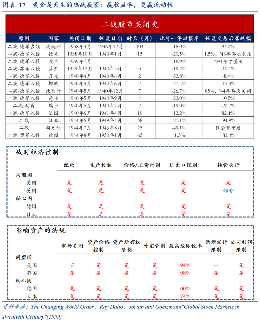 二嬴流动性:以二战为例,轴心国、同盟国都实施了严格的战时经济控制,涵盖生产、价格、工资、进出口、接管央行等,资产法规包括关闭股市、严格的价格/所有权限制、外汇管制、高边际税率等;资本战交织热战,也指向增量黄金需求。