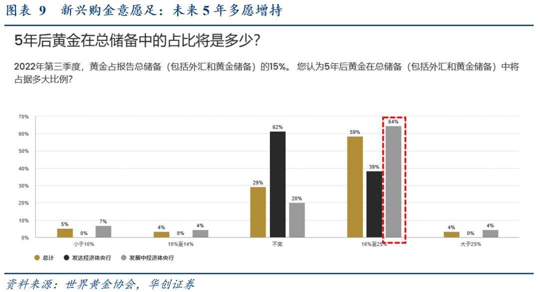 意愿足。据世界黄金协会《2023年央行黄金储备调查》,当被问及黄金未来在全球储量中的份额时,38%的发达经济体受访央行认为黄金份额在未来5年将会上升,而持有相同观点的新兴经济体受访央行比例高达68%。