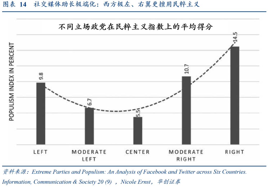 极端思潮更极化。信息茧房之下极端者更易找到认同,社交媒体为政客们提供了更扁平、去层级化的信息发布渠道,尤其有利于民粹主义信息的传播。