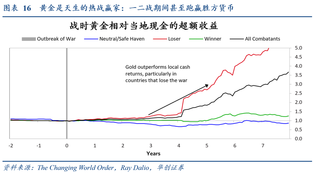一嬴收益率:1812年战争、拿破仑战争、美国内战期间,黄金对美元、英镑等主流储备货币大幅升值;据桥水对一二战期间资产表现的统计,黄金对参战各国现金均有超额收益,大幅跑赢败方货币,甚至跑赢胜方货币。