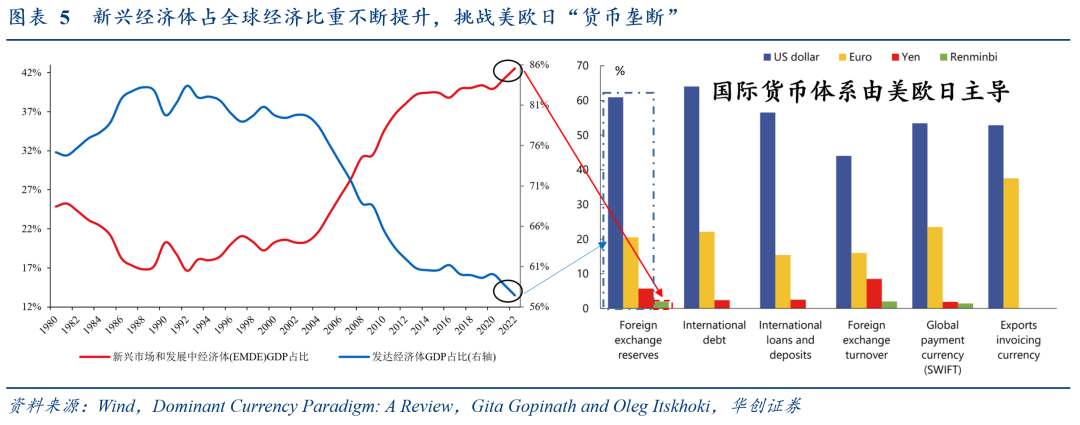 据世行预计,2022-2030年新兴经济体的潜在增速明显高于发达经济体。新兴经济体占全球经济比重由当前约40%不断提升,将不断挑战美欧日在外储、债务、支付等领域90%+的“货币垄断”,可由两条路径“用脚投票”: