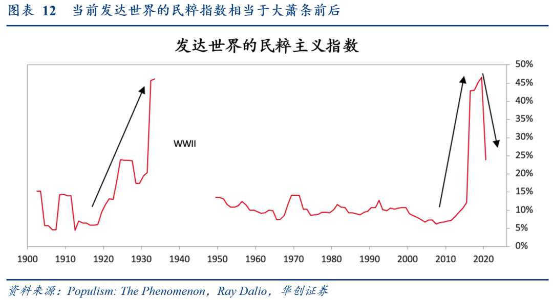当前发达世界的民粹指数虽由二战高点回落,仍相当于大萧条前后,体现为: