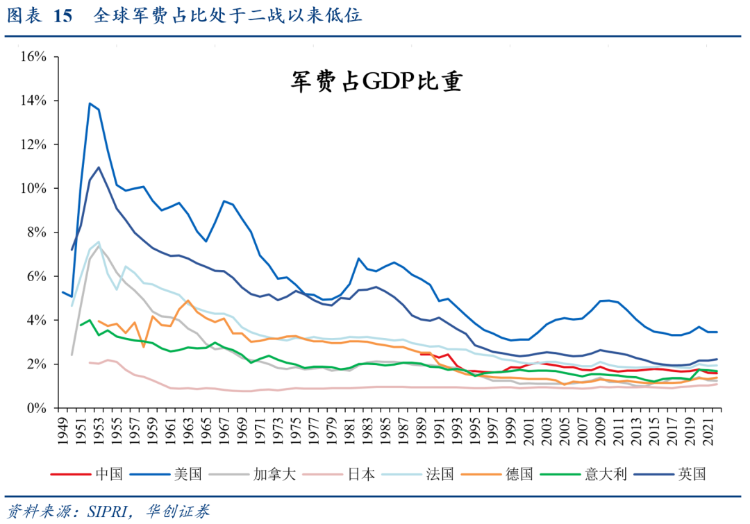 当前主要国家军费占比GDP处于二战以来低位,俄乌、巴以冲突下,不排除局部区域军事进一步动荡化的可能,黄金是天生的“战争赢家”: