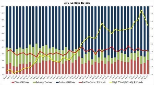 作为衡量海外需求的指标,通常由外国央行等机构通过一级交易商或经纪商参与竞标的间接竞标者(Indirect Bidders)获配比例为66.4%,创今年9月来最低,大幅低于上次拍卖时的比例74.0%。这是又一个体现拍卖不佳的指标。