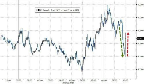 20年期美债拍卖结果出炉后,20年期美债收益率自4.18%下方反弹,逼近4.2%,日内当前整体跌约2个基点。美股下午时段,三大股指在拍卖数据出炉后一个小时后跳水。