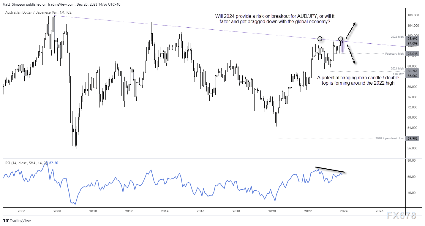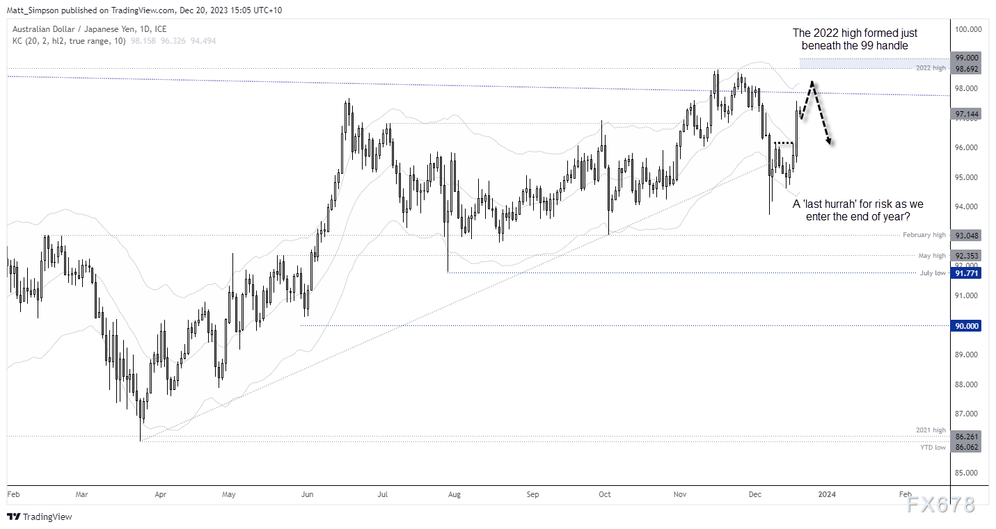 澳元/日元能够轻松创出新高吗?如果圣诞行情能够延续,那么澳元/日元可能测试2022年的高点(98.54附近),但突破99附近阻力非常困难。对本月剩余时间可持谨慎看涨态度,一旦在这些高点附近出现熊市动能转移的迹象(如出现空头吞噬线),可迅速平仓。