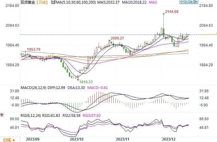目前黄金价格正在努力寻找方向,进一步上涨似乎静待东风。随着2024年3次降息的预期加深,以及通胀率迈向2%的重大进展,美元开启下跌趋势,贵金属预计将继续获利。美联储政策制定者将最近金价的上涨描述为“夸大”,理由是央行正在关注货币政策还能持续多久,应保持紧缩政策以实现价格稳定,而不是目前降低借贷利率。目前黄金处于持稳平衡状态,等待下一个重要的经济基本面数据或消息。如果本周接下来的宏观数据尤其是反映通胀方面的数据继续显下降,将进一步支持美联储明年可能更激进地降息的观点。