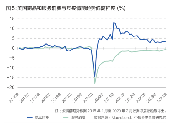 从消费结构上看,服务消费持续回升,降低了整体消费对利率的敏感度。在疫情暴发初期,服务消费场景受限,政府向居民的转移支付转化为商品消费支出的快速增长。疫情管控解除后,消费结构逐步从商品消费向服务消费(尤其是线下服务)转变(图5),服务消费的持续增长为2022年以来美国整体消费提供了强劲支持。与商品消费(尤其是大件耐用品)相比,服务消费融资需求较低,对利率变化的敏感性较弱,削弱了加息对整体消费的抑制作用。