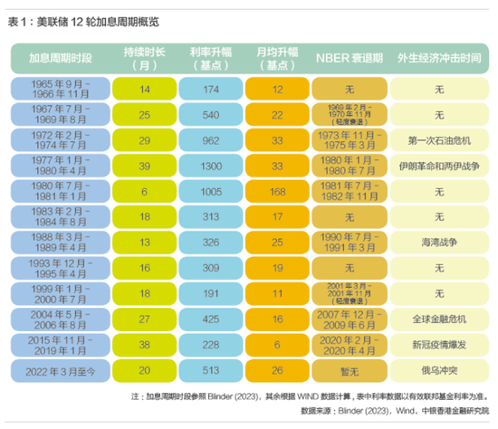 1.持续时间。1960年代以来完成了11轮加息,其中,最长时间为1977年到1980年的39个月和2015-2019年的38个月,最短时长为1980-1981年的6个月,11轮加息平均时长为22个月(见表1)。自2022年3月开始的本轮加息周期迄今为止为20个月,大致居于中等水平。依照当前市场预期,本轮加息周期已于2023年7月结束,则相应时长为16个月,为中等偏低水平。