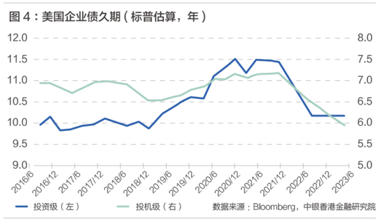 与居民部门类似,企业部门的资产负债表状况良好,减轻了货币紧缩对企业投资的不利影响。美国企业的资产负债率保持在相对较低水平,并拥有充足的流动性资产(图3)。在2020至2021年的低利率环境下,企业大规模举债的同时延长了其债务久期(图4),因此,发债企业在短期内偿还压力不大,大幅发行高利率债券以展期现有债务的急迫性不强。这些因素减轻了高利率对企业经营和投资的负面影响。