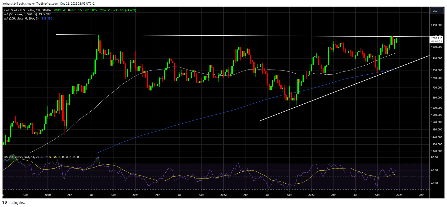 该形态的特点是水平阻力线和上升支撑线,阻力线明确位于2070.63美元,标志着三角形的上边界。与此同时,支撑线从1616.67美元开始上升,在1810.46美元处形成第二个重要点。