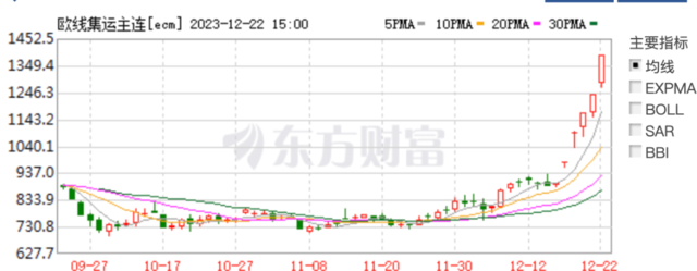 集运指数(欧线)期货主力合约此前已经连续3个交易日触及涨停,12月22日早盘再度触及涨停,报1236.8点,连续四个交易日累计涨近40%。