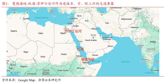 浙商证券指出,曼德海峡-红海-苏伊士运河作为连接亚、非、欧三洲的交通要塞,是世界上最繁忙的航线之一,这条航线的通行状况对国际供应链至关重要。