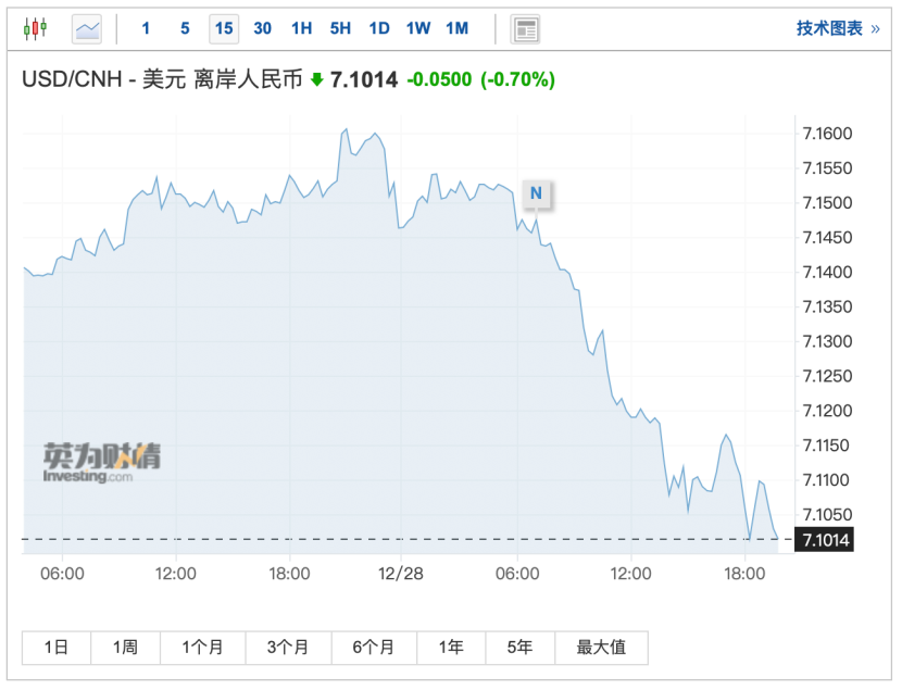 另外,离岸人民币兑美元日内一度升至7.1006,大涨超500点。