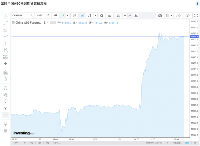 同时,富时A50中国指数期货持续走强,最高涨幅一度扩大至2.7%。
