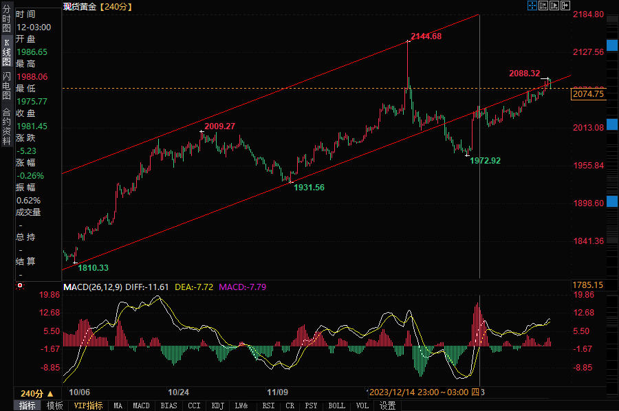 金价的上升趋势已经重新回到看涨通道,这是一个重要的技术性利好信号,预示着金价有可能进一步大幅上涨。在昨日的市场中,现货黄金的收盘价上涨了9.73美元,涨幅达到0.47%,报收于2077.50美元/盎司。