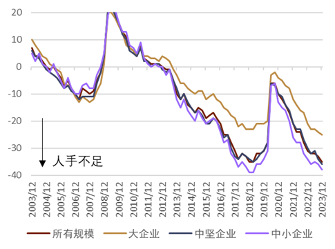 答:我并没有一个明确的定量的指标,但是大致来说,希望2024年的涨薪幅度会好于等于2023年春季的结果(我们认为2024年的涨薪可能会好于2023年,图表4)。但是,判断涨薪是否到了那个程度,并不是基于一个一个特定的数据或者事件来判断(日本央行经常使用“综合判断”的表述,增加自身的政策灵活性)。当然我会看各类数据,但是在此之外,我会基于宏观的劳动的供需情况(总体来看,日本劳动市场当中人手不足的情况还在持续,图表5),以及还没反映到数据当中的各类中小企业那里听来的信息(听来的信息会早于数据的发布,所以该表述也是表达了日本央行不会等所有数据出来后再行动)来综合判断。