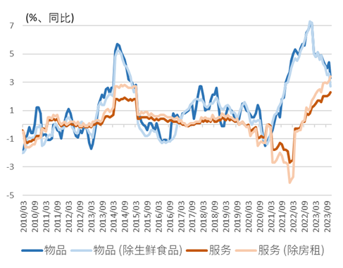 答:2024年的涨薪以及在那之后对物价的影响很重要,但是回到短期的话题,我们想观测2023年上涨的工资如何反映到2024年的服务价格的上升。2023年服务价格已经开始上升,我们关注这个倾向是否会持续(未来或许比起综合CPI同比走势,更需关注日本CPI当中服务通胀的走势)。