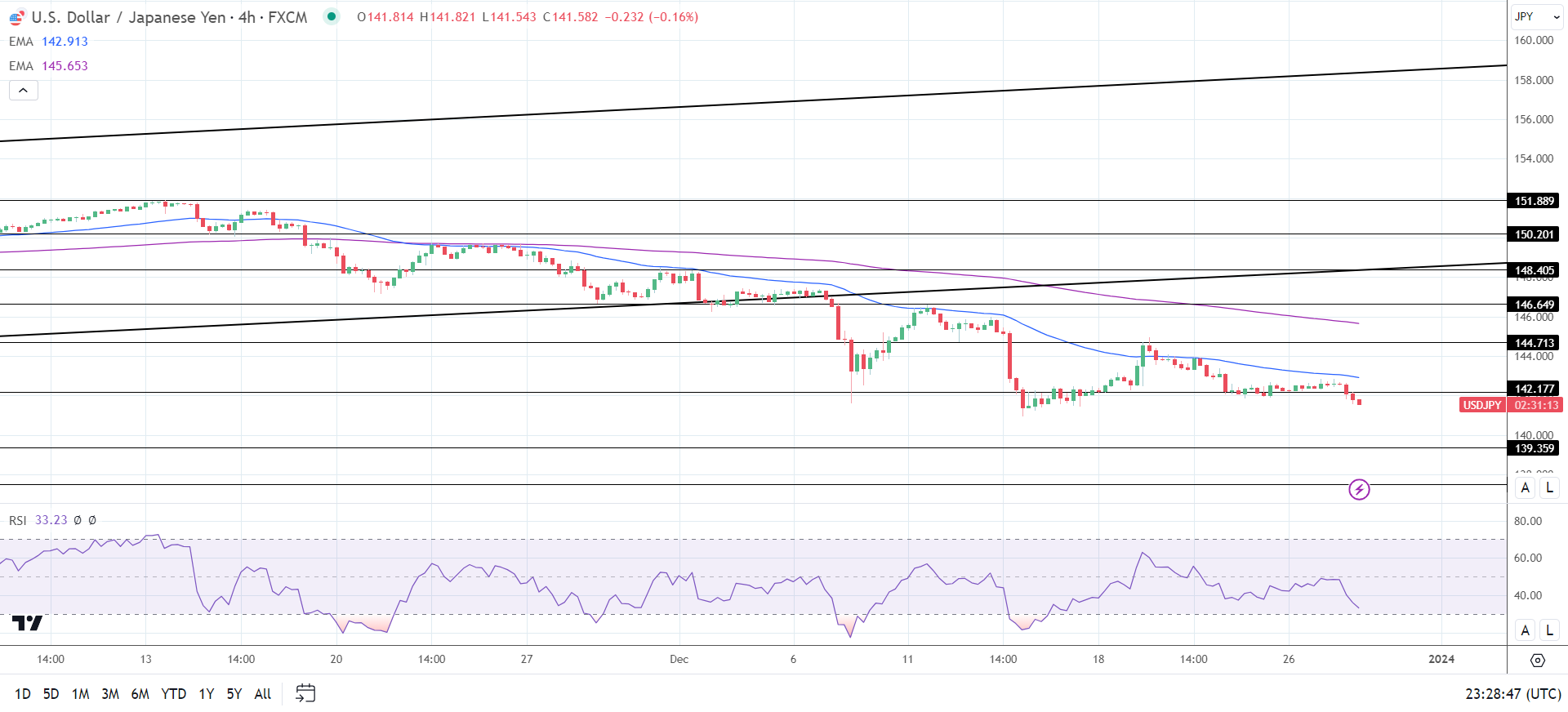 14周期4小时RSI为33.23,表明美元/日元在进入超卖区域之前跌破141关口。