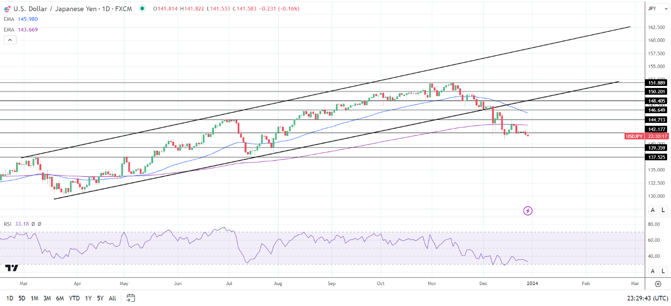 14天RSI为33.18,表明美元/日元将跌破141关口,然后进入超卖区域。
