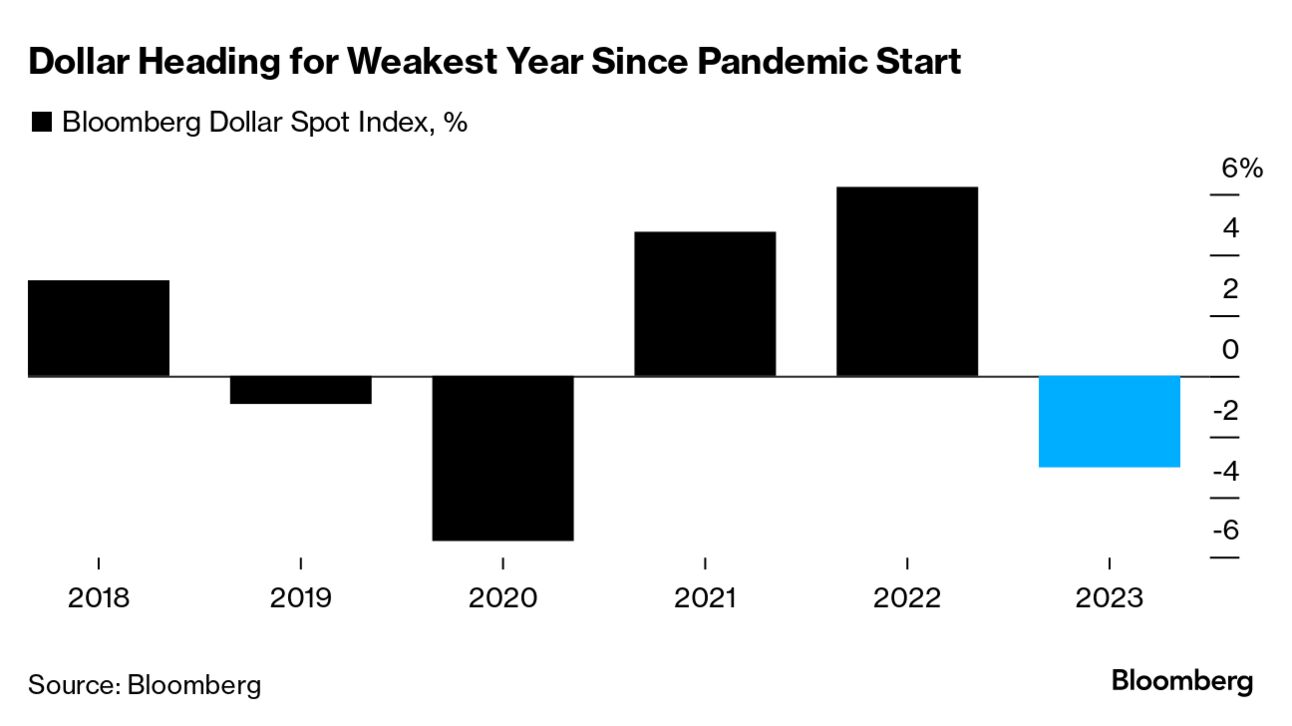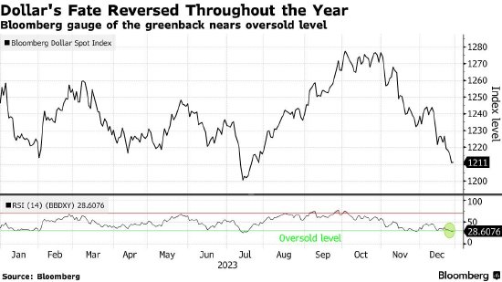 由于华尔街押注美联储将在安全控制住物价后降息,美元将遭遇疫情暴发以来表现最糟糕的一年。Bloomberg 美元指数自1月份以来下跌了近3%,这是自2020年以来的最大年度跌幅。美元的大部分跌幅发在在第四季度,因为越来越多的人押注美联储明年将随着美国经济放缓而大幅放松政策。掉期交易员目前预计美联储将至少降息150个基点,最早将于明年3月首次降息。不过,美元仍有暂时反弹的空间。Bloomberg美元现货指数的14日相对强弱指标最近跌破30,暗示美元现在处于“超卖”状态,走势可能即将反转。