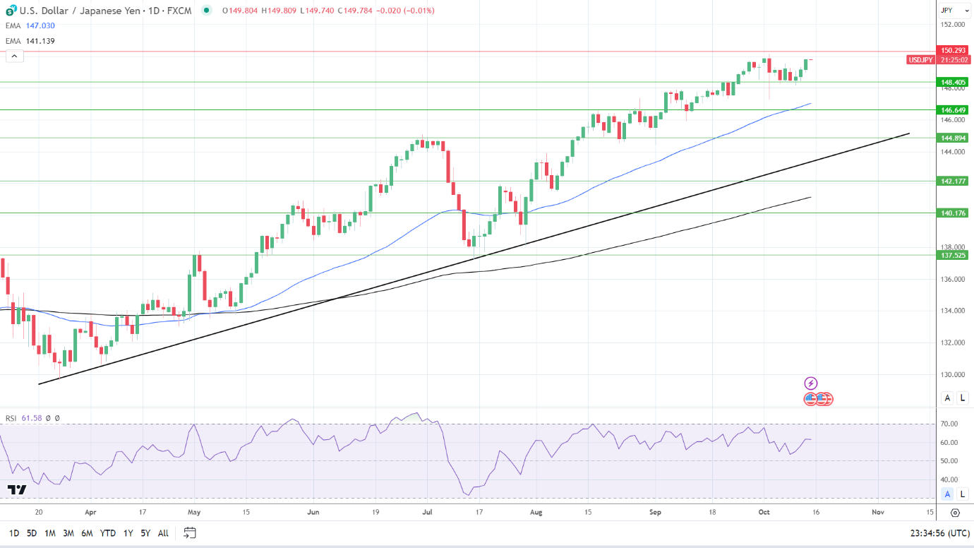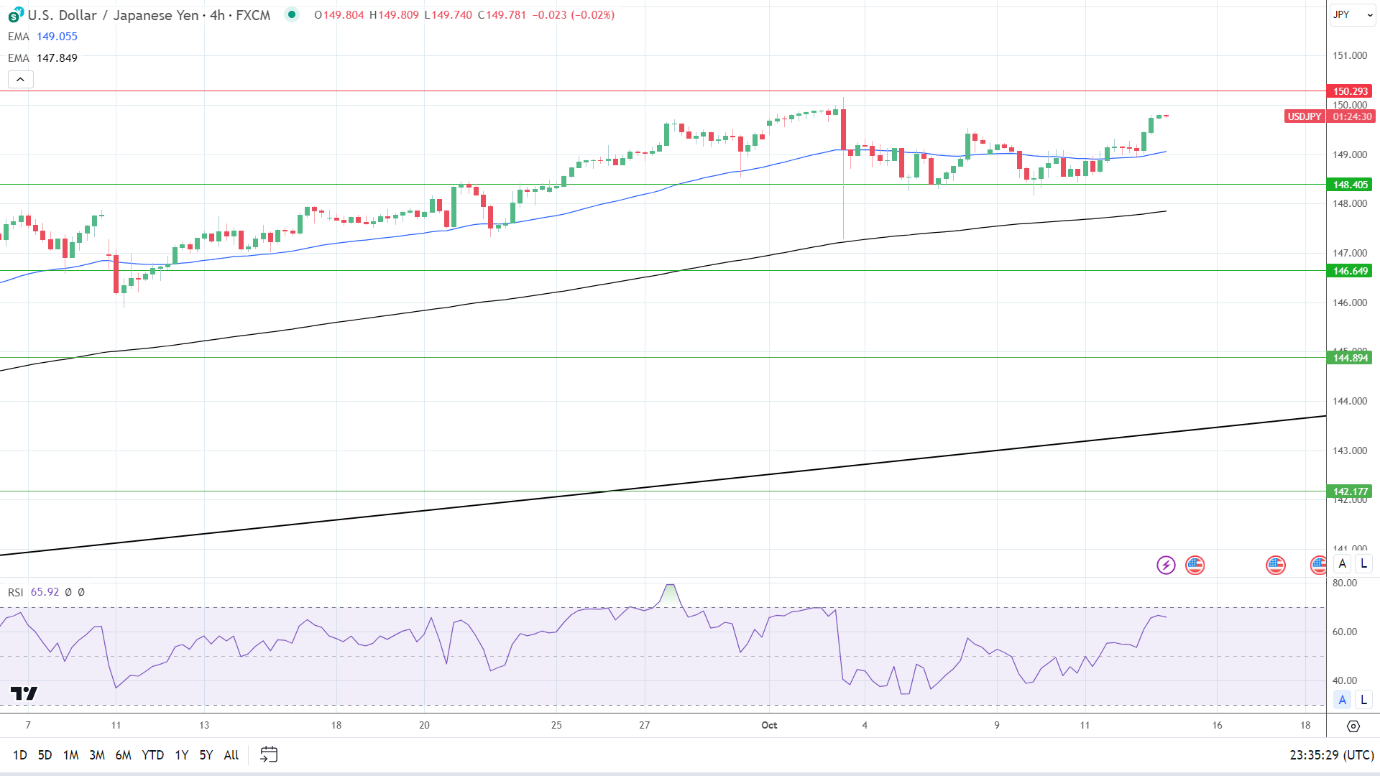 14-4小时RSI的65.92支持美元/日元在进入超买区域之前,升至150.293阻力位。