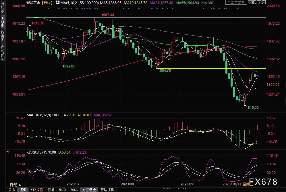 现货黄金收跌0.29%(或5.5美元/盎司),收报1868.67美元/盎司。
