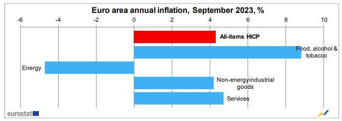 上月月底,欧盟统计局公布的初步统计数据显示,受基数效应和需求下降影响,欧元区9月的年通胀率从5.2%超预期放缓至4.3%,其中能源价格同比下降了4.7%。