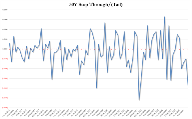 此次30年期美债的得标利率创2007年8月以来新高,而且较预发行利率4.800%高3.7个基点,连续四次标售出现得标利率高于预发行利率的所谓尾部,本次的尾部为2021年11月以来最大,为有纪录以来第三大尾部。