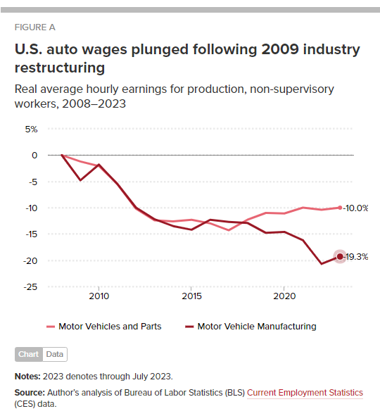 美国劳工统计局数据显示,自2008年以来,汽车制造业工人的平均时薪在扣除通货膨胀因素后下降了19.3%,包括更广泛的机动车零部件行业在内,下降了10%。