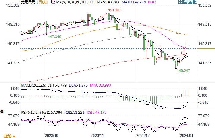 上周五(1月5日),在美国喜忧参半的数据公布后,美元指数变化不大,而美元兑日员的波动则较为激烈,美元兑日元全日小幅上涨至144.655。在就业数据公布后,美元兑日元一度创下145.98的三周高位。且当周来说,美元兑日元上涨2.2%,创下2022年6月以来的最佳单周表现。周五来自美国的数据显示,美国在12月新增21.6万个就业岗位,超过了17.0万个的预测后。失业率保持在3.7%不变,预期为3.8%;平均时薪环比上涨0.4%,预期为上涨0.3%。12月份就业市场数据表现极佳。不过,稍后公布的数据部分抵消了就业报告的影响,数据显示美国服务业活动在12月下滑。供应管理协会(ISM)称,12月美国非制造业采购经理人指数(PMI)从11月的52.7降至50.6,为5月以来新低。更重要的是,12月服务业就业分项指标骤降至43.3,为2020年7月以来最低。有分析师称,就业报告暗示,美联储可能不会急于在未来几个月内降息。美元也是因此受到一定力度的抬捧维持着年初以来的升势。从4小时图上观察,美元兑日元回升过急,出现超买,在146水平附近遇到较韧性的阻力,短线或存在超买回调的交易节奏。当前143.80-144.00附近提供初步的支撑,进一步支撑在143附近。上方若穿破146水平,则有望向148挺进。