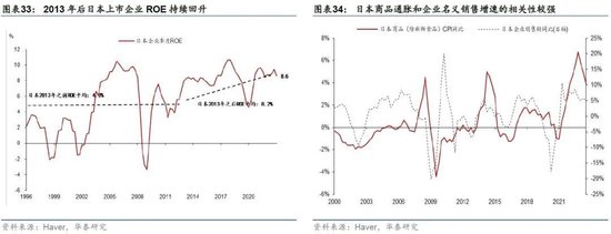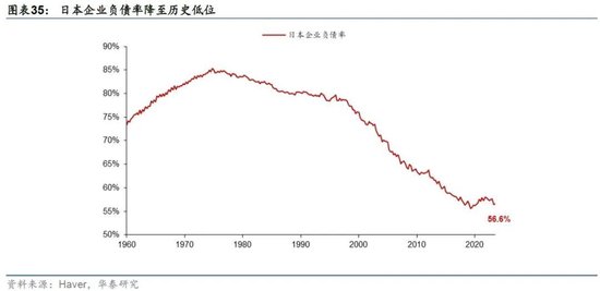 ☞ 2024年日本盈利周期有望持续改善,ROE或进一步回升,从而支撑企业资本开支周期。2013年安倍经济学推出后,日本上市企业ROE明显回升,MSCI日本的ROE从1995-2012年的平均4.3%回升至2013-2022年的平均8.2%(图表33)。一方面,超宽松货币政策推动日本通胀中枢上行,改善企业名义盈利水平;另一方面,日本一系列企业治理改革也提高了上市企业的盈利水平。往前看,预计2024年日本企业盈利周期的改善有望持续,从而支撑企业资本开支周期。根据杜邦公式,ROE=净利润率×总资产周转率×权益乘数。净利润率、周转率和企业杠杆率都有可能趋势性回升并带动ROE上行。2024年日本维持再通胀,可能改变日本企业的定价策略,从而提高净利润率。正如日央行副行长冰见野良三所说,高通胀丰富了企业的定价策略,打开了提价空间;部分企业通过对高附加值产品与服务提价来应对人力和原材料成本的上行。高通胀也可能通过提高企业销售额从而加快周转率(销售收入/总资产)(图表34)。此外,如此前所述,2024年日本真实利率将维持较低水平,而企业杠杆率也已降至历史低位(图表35),不排除企业进一步增加杠杆率,即推高权益乘数(总资产/股东权益)。