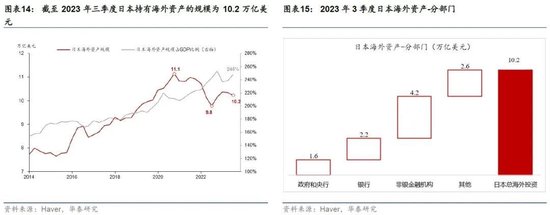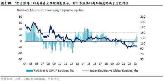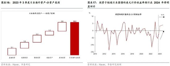4. 日本企业海外投资回流、及海外对日本的直接投资均可能加速。2014年以来日本持有的海外总资产规模从7.7万亿美元大幅上升至2023年3季度的10.2万亿美元(图表14)。分部门来看,包括寿险公司、养老金等非银金融机构是日本海外资产的最大持有人,2023年3季度持有的海外总资产为4.2万亿美元(图表15);银行持有海外资产2.2万亿美元,政府和央行持有1.6万亿美元。从资产类别来看,2023年3季度直接投资为2.1万亿美元,证券投资4.1万亿美元(债券2.2万亿美元,股票1.9万亿美元),其他投资2.8万亿美元,储备资产1.2万亿美元(图表16)。预计2024年美日、欧日等短端利差明显收窄约200个基点,结合日元快速升值,日本国内企业投资海外的资产有望回流。以美国投资者为例,投资于短端日本国债的美元计价收益率预计在2024年将明显回升(图表17),考虑到联储在2024年或降息150个基点,进一步增强了日本的吸引力。同时,不排除海外资产配置日本的动力进一步上升。根据2023年12月彭博上美林基金经理调查,超配日本股票的占比下降11个百分点至12%,略高于历史均值,没有处于较为极端的位置(图表18)。